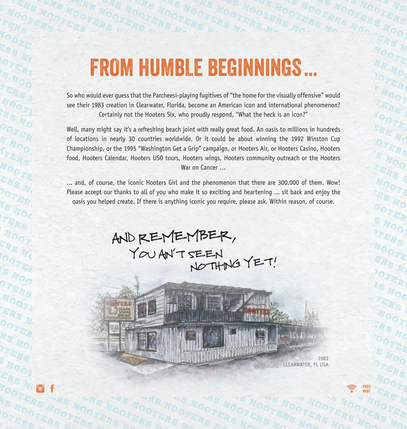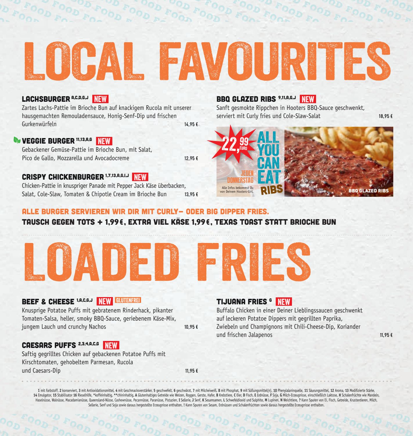 Grilled cod served on soft tortillas with pico de gallo, cabbage and house spicy sauce. 100% meatless with the full flavor of hooters wings. 42% fat, 36% carbs, 22% protein. Marinated overnight and oven roasted to seal in the flavor with only half the calories! It's six original hooters buffalo shrimp, six boneless wings and six original hooters style wings, all smothered in your choice of our legendary sauces.