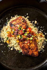 Pan Seared Salmon With Mediterranean Salsa Fresca And Toasted Couscous / Pin on Everyday Recipe Reference / Chicken souvlaki kebabs with mediterranean couscous.. Add the fish, skin side down, and cook until lightly browned. This pan seared salmon is healthy and easy enough to make on a weeknight. Join imgur emerald to award accolades! Turn and finish until firm. While the salmon cooks, whisk together the crème fraîche (1/2 cup) , dill (2 tablespoon), and granulated garlic (1 tsp) in a small bowl until smooth.