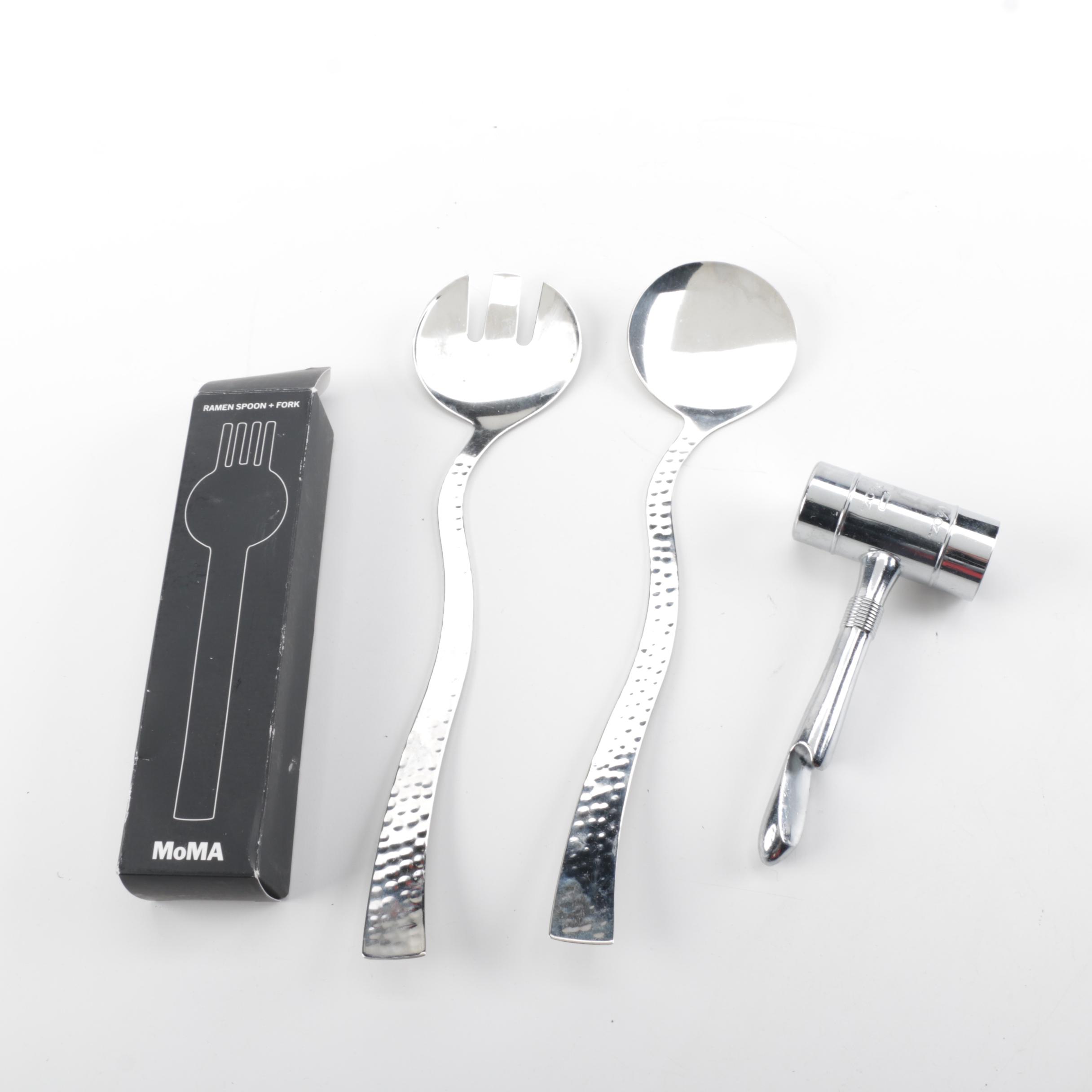 Combination spoon and forks easily twist noodles and ladle soup.